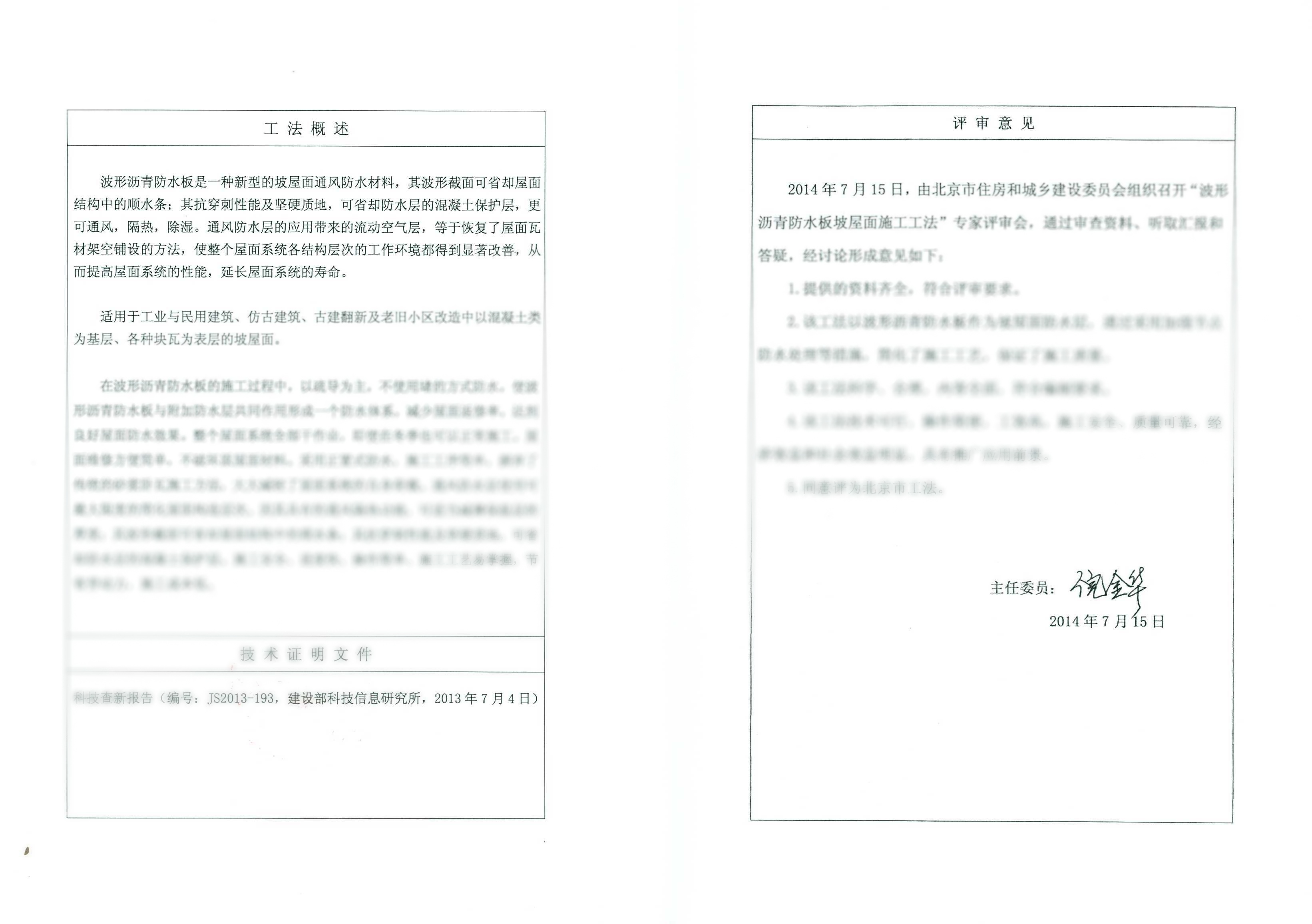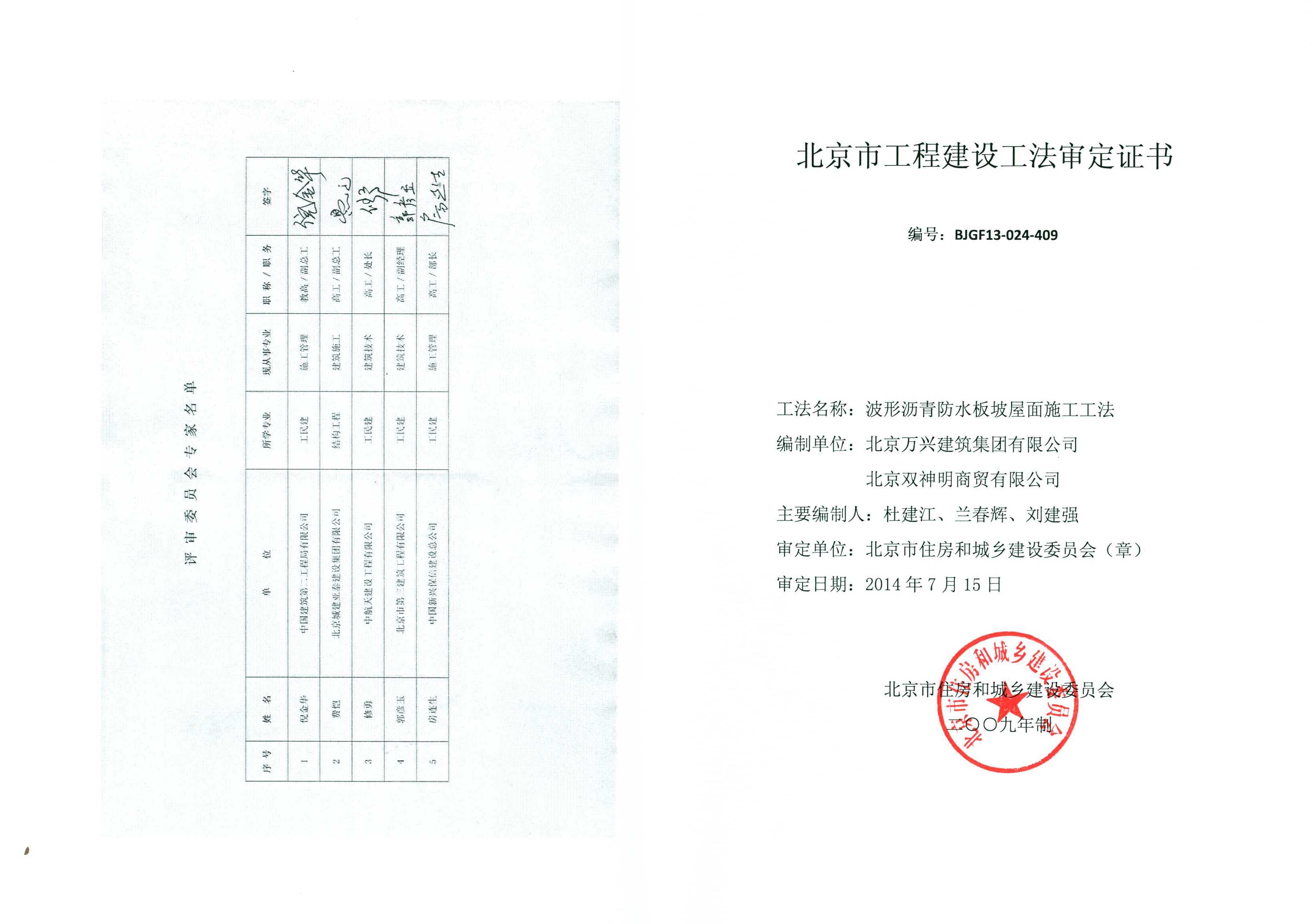 北京市工法—波形瀝青防水板坡屋面施工工法審定證書(shū)