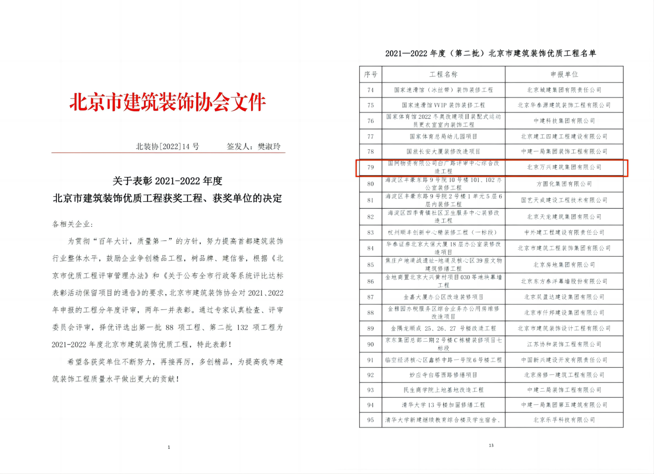 【概要描述】近日,北京萬興建筑集團承建的國網(wǎng)物資有限公司白廣路評審中心綜合改造工程喜獲2021-2022年度(第二批)北京市建筑裝飾優(yōu)質(zhì)工程。