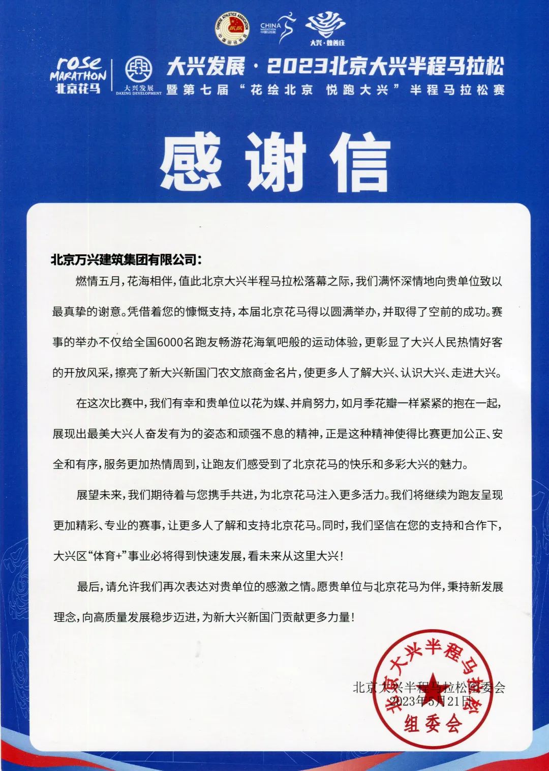 【概要描述】近日,適逢中國共產黨建黨102年之際,萬興集團收到北京大興半程馬拉松組委會的“情系花馬 慷慨支持”的錦旗和感謝信,感謝萬興集團對花馬賽事的慷慨支持。