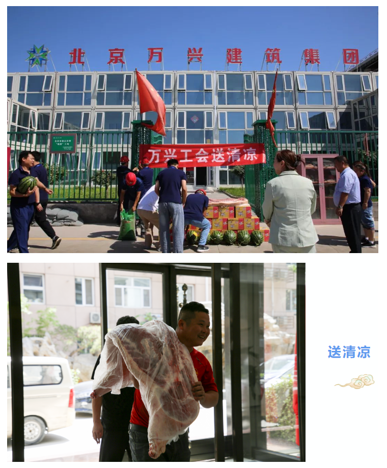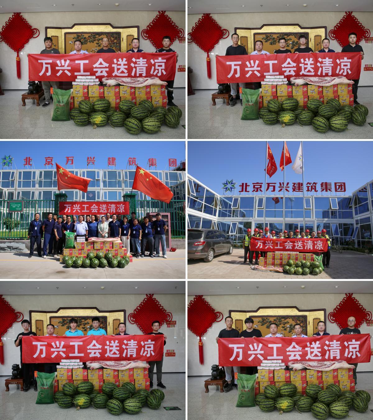 【概要描述】入夏以來,北京持續高溫,為做好項目一線職工勞動保護和防暑降溫工作,7月6日,萬興集團工會積極開展“送清涼”慰問活動,深入西片區安置房項目、大興區檔案館新館項目等10個集團重點在施項目一線,貼心地為一線建設者送去藿香正氣水、冰紅茶、西瓜、豬肉、綠豆等防暑降溫慰問品,感謝他們為項目建設所付出的辛勤努力。