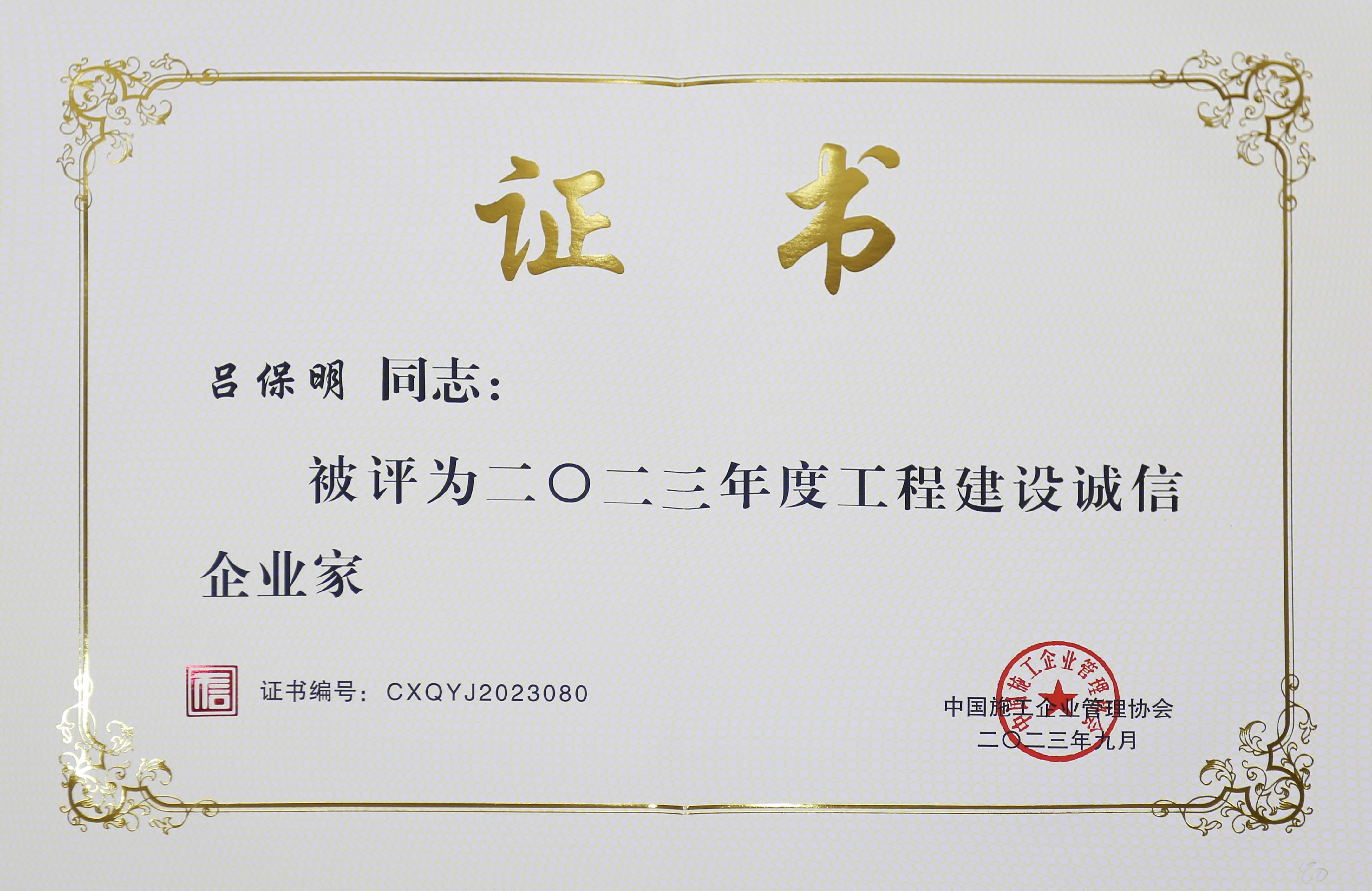 集團黨委書記、董事長呂保明被評為工程建設誠信企業家