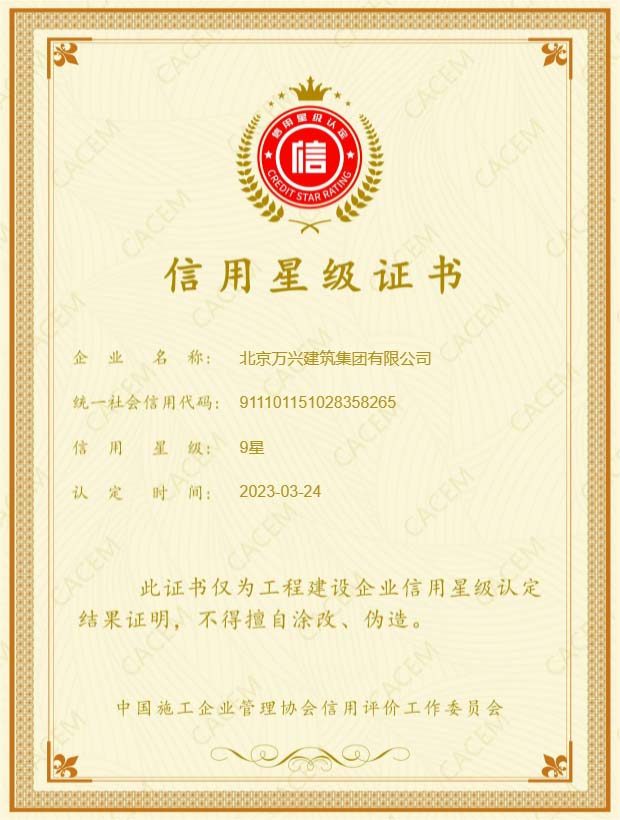 萬興集團憑借在誠信經營、履約守信、社會責任等方面的突出表現,獲得工程建設AAA信用等級企業等四項殊榮。這份榮譽充分說明了行業內對萬興集團誠信建設管理工作的普遍認可。