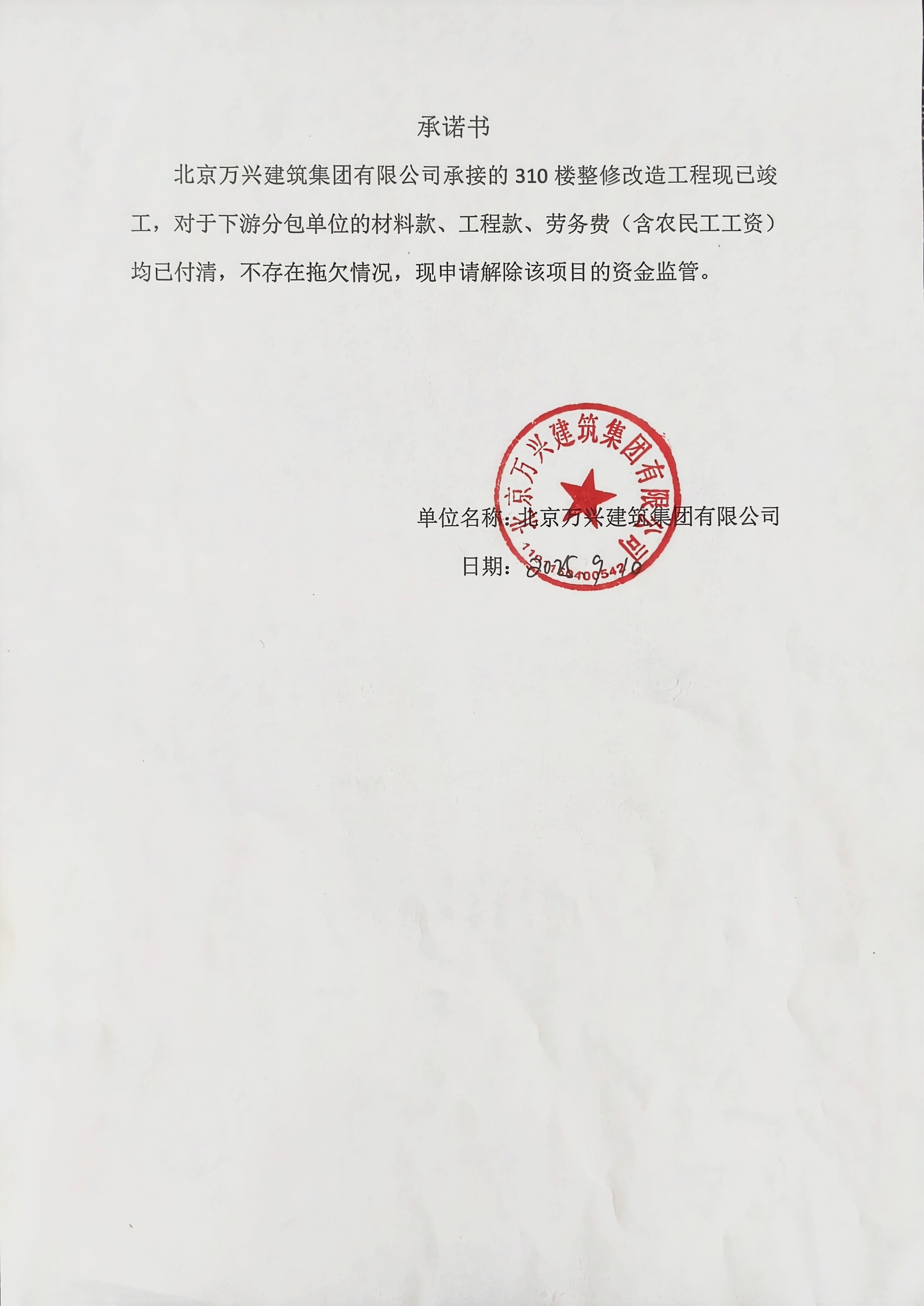 2025年9月10日,北京萬興建筑集團有限公司針對承接的310樓整修改造工程申請解除資金監(jiān)管做出承諾,現(xiàn)將《承諾書》(附件1)在本網(wǎng)站進行公示。